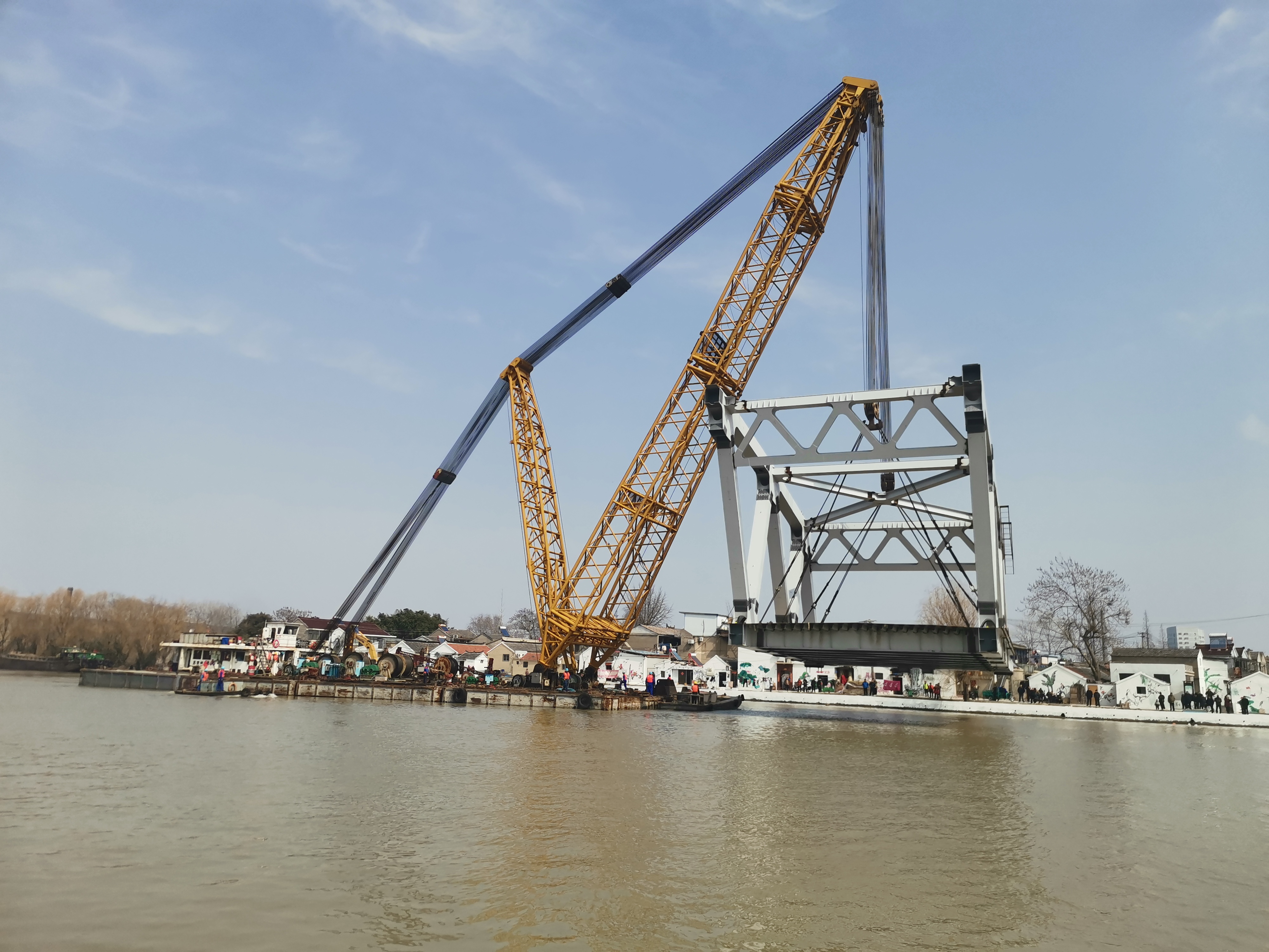 3月3日,京杭大運河兩岸人頭攢動,在全體參建人員的奮戰(zhàn)拼搏下,由江蘇交工承建的蘇北運河最大跨度拱形鋼桁架橋梁——揚州寶應運河大橋主跨135米鋼桁梁首節(jié)成功架設,標志著該項目進入鋼桁梁吊裝階段,主跨貫通勝利在望。